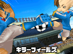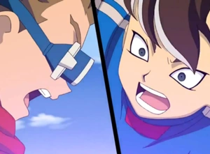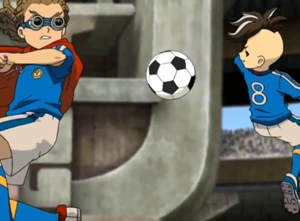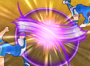 Les deux joueurs sautent en l'air et utilisent leurs pieds pour frapper simultanément dans le ballon. Un tourbillon violet se crée, permettant d'empêcher les défenseurs d'atteindre le ballon et de passer non loin du but.