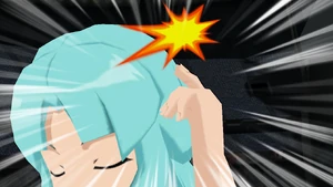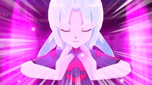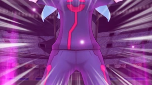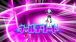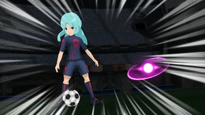 The user comes to a sudden halt with the ball by their feet, quickly getting into position and placing both of their hands palm-to-palm, closing their eyes as a circle of purple energy forms underneath them, turning the surrounding area dim. As they slowly lean their upper body forward, the energy circle rapidly extends itself towards their opponent, leaving them confused and gradually engulfing them. They then snap their left hand fingers and raise their left arm into the air, abruptly swinging it downwards and opening both of their eyes again, coming back into reality and making their opponent emerge from a purple shockwave behind them.