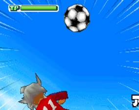 The user kicks the ball in the air and quickly springs towards it, spinning the ball with their right foot and reeling back their right leg, turning the surrounding area into a spacelike dimension. As the ball turns into a dark purple energy sphere, it draws in debris from the field, surrounding itself with purple and red swirls of energy. They then kick the energy sphere, making it grow and tear through the field as it heads towards the goal.