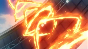 When it was used by Kidokawa Seishuu[20], three users cross their arms and get into a triangle-shaped formation, quickly turning around and reeling back their right legs. As they kick the ball high into the air, multiple yellow triangles surround the ball as the fourth user follows behind, quickly spinning clockwise with their legs surrounded by a stream of fire, setting the triangles ablaze. Once they close in on the ball, they volley it with their left foot, setting it ablaze and curving down in a fiery storm as it heads towards the goal.