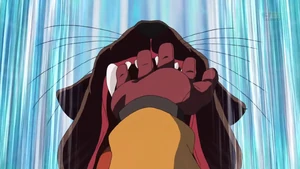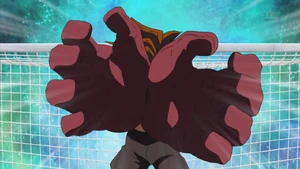 The user gets into position, quickly spreading out their arms diagonally and rapidly joining them together, extending them forward and placing their open hands on top of each other, with a howling beast appearing behind them. They then reel their arms back and rapidly extend them again, opening them and creating fanglike hands of bright green energy. As the ball heads towards the goal, they abruptly clamp their hands together, with the beast biting down on it, catching it in both of their hands if successful.