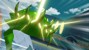 The user quickly gets into position, raising their right arm into the air and making a carnivorous plant sprout out of the ground behind them, akin to a Venus flytrap. As the ball heads towards the goal, the plant twists itself onto the incoming shot, opening its jaw and revealing its blue mouth, rapidly snapping at it and making its maw shine brightly, with the user dispersing the plant and winding back their right arm if successful.