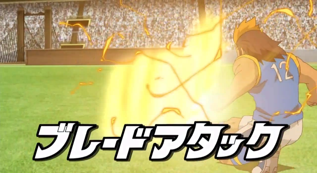 The user sprints towards their opponent, flipping forward with their right foot raised. Once they slam it onto the field, an electrical shockwave heads towards their opponent, blinding them and blowing them away as the ball slowly bounces back towards them.
