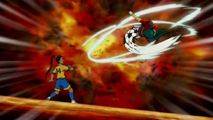 The user dribbles towards their still opponent, coming to a sudden halt and springing high into the air alongside the ball. They then trap the ball in their right foot and quickly get into position, performing a frontflip and rapidly spinning around as the background is tinged with scarlet. As they keep on spinning in the air, the ball stretches itself and coils around them, akin to a spring, abruptly letting go of it and lashing it at their opponent, coming back into reality as they're blown away, picking up the loose ball as they land ahead on the field, successfully getting past them.