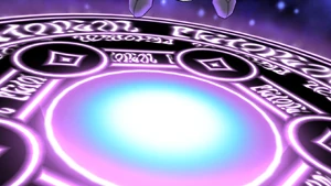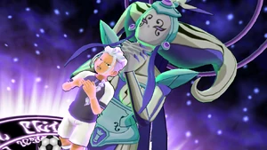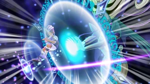 The user comes to a sudden halt and traps the ball between both of their feet, quickly joining their hands together and placing them below their chin, turning the surrounding area into a spacelike dimension. As a shining circle of ancient runes appears below them, their Keshin emerges from it, with both of them rapidly lifting themselves into the air. Once the user gets into position, their Keshin extends both of its hands, creating a bright blue circle of energy engraved with ancient runes, sending swirls of bright blue energy onto the bright purple-covered ball. The user then dives onto the ball with both of their feet, coming back into reality as it heads towards the goal, with the orb of bright purple and blue energy continuously growing.