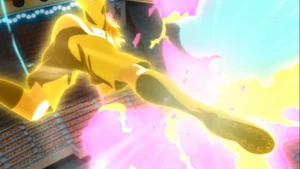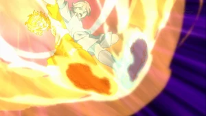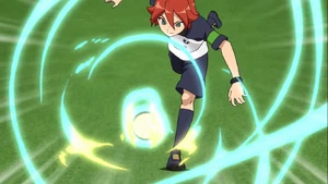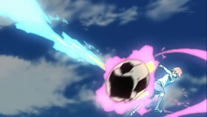 Hiroto and Tatsuya used this technique for Inazuma Japan during the match against Olé de Samba. After stealing the ball from the Brazilians with the hissatsu tactic Jiraigen, Hiroto and Tatsuya advanced to the opponents' goal and used this Override technique. Macero tried to stop it with his Macaroni Spaghetti, but Cosmic Blaster proved to be too strong, and it went in, equalizing the score.