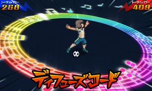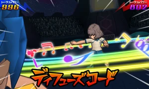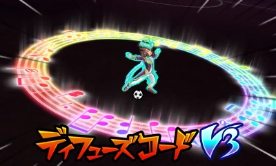 The user comes to a sudden halt with the ball by their feet, closing both of their eyes and waving their arms in the air, akin to a conductor conducting an orchestra, making a rainbow-colored veil of light with hovering musical notes undulate around them. They then reel back both of their arms and outstretch all of their limbs, turning the surrounding area dim and changing the veil of light into a staff, connecting the hovering musical notes onto it and making it flash. Once they stomp on the ball with their right foot, they quickly get into position and open both of their eyes again, bending their left arm downward while winding their right arm diagonally, abruptly thrusting their arms to their left side and diffusing the staff into their incoming opponent, coming back into reality as they fall onto the ground.