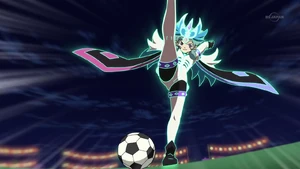 In the match between Nippon Daihyou and America Daihyou[5], Beta used it while Keshin Armed with her Keshin, Athena, breaking through Shinsuke's defense and successfully scoring Nippon Daihyou's ninth goal.