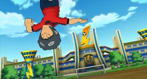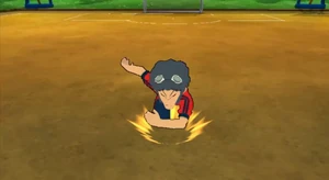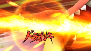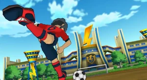 The user reels back their right leg and kicks the ball high into the air, quickly backflipping and getting on their knees. They then spring towards the ball and extend their right leg to the side, setting it ablaze as the yellow-eyed, red dragon appears behind them. The ball is set ablaze as they kick it, making the dragon roar and follow it behind as it heads towards the goal.