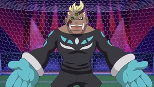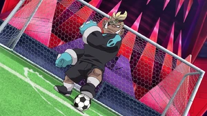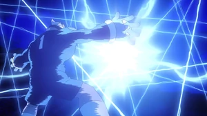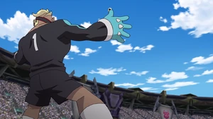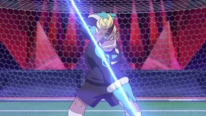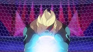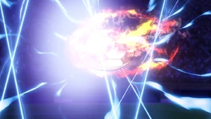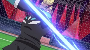 The user gets into position, quickly flailing their arms around in the air and sending several, fleeting electrical lasers in front of them. Once they stop flailing their arms around, they join their fists together and gather electriclike energy in their hands, reeling them back and making the fleeting electrical lasers fully appear, akin to a laser fence. As the ball heads towards the goal, it hits one of the electrical lasers, which rapidly cluster into a bright blue spark, scattering it into the air and landing on top of their left foot if successful.
