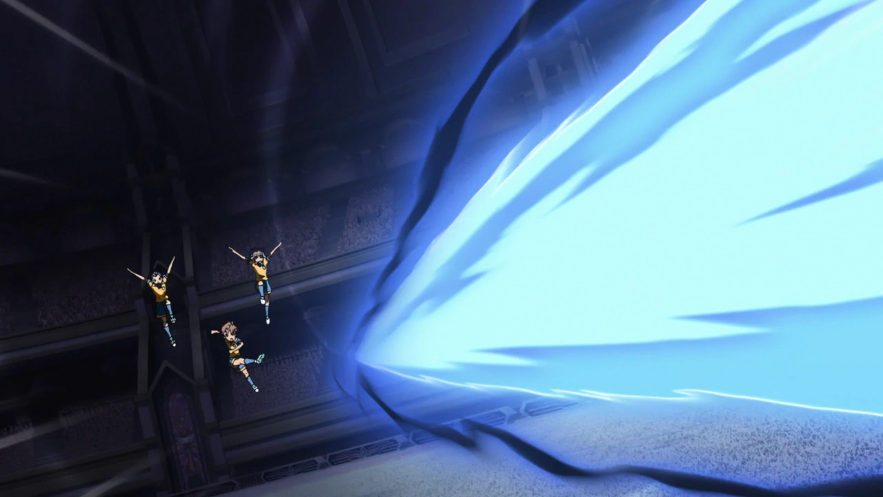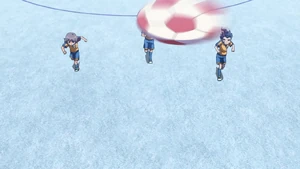 Three users run while leaning their upper bodies forward, with one user in the back as the other two dash ahead of them. The two users in the front then spring and spin towards the airborne ball while the one in the back keeps on running below them, getting into position and abruptly diving onto the ball and kicking it down with their heels, covering it in bright blue energy with dark swirls of black lightninglike energy. As the ball goes down, the user below springs towards it, volleying it with their right foot, heading towards the goal in a spiral of wind.