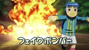 As their opponent dribbles with the ball, the user quickly runs past them, switching the ball with a fuse bomb. They then see the bomb resting on their right foot, shocking them as they kick it away, abruptly exploding as the user dribbles away in the distance, successfully stealing the ball from them.