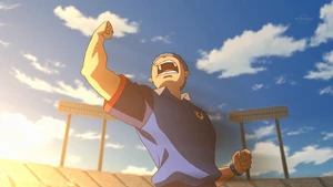 This technique was first used during the final match of the Football Frontier International's Asia Regional Qualifier between the Soccer Zatsugidan and Inazuma Japan. After training hard to improve his Fire Lemonade, Goujin finally stood on the field. After receiving a long pass from Asuto, Goujin fired his new improved Fire Lemonade, Fire Lemonade Rising, towards the opponent's goal. The shot broke through Min Yingqi's Bakugui Shishi, as the weight of the shot was all about all the people supporting Goujin. Even with help, Bakugui Shishi couldn't save the shot, so it broke through. It then faced Kung Fuche and his Ryuujin Tessen, but it was no match for this powerful shot. It broke through and blasted the goal away, scoring Inazuma Japan's first goal, making the score 1-2.
