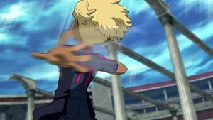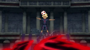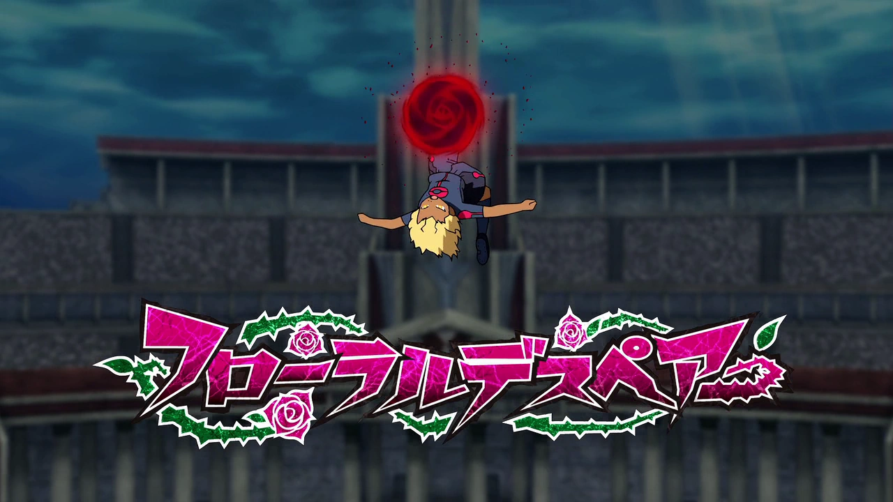 The user twirls around in the air alongside the ball with both of their eyes closed, coming to a sudden halt and swinging their right arm to the side, opening their eyes again as swirls of black and red energy viciously cover them. As the surrounding area turns dark blue, a flower with dark red petals and green sepals appears and begins to rapidly bloom, releasing both its red pollen and the user, who's curled with their head on their knees while hugging them. Once they reel their body back, they gracefully backflip onto the airborne ball and raise their left leg as it's quickly covered in swirls of black and red energy, abruptly shooting it with their left foot and coming back into reality, heading towards the goal in a beam of black and red energy and leaving a trail of dark red petals behind.