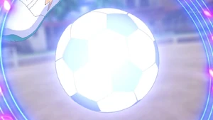 The user runs as the ball slowly falls in front of them, getting into position and hopping off of the field, reeling back their right leg. As the ball gets covered in a fleeting bright blue glow, a bright blue staff with bright purple musical notes encircles it. The user then shoots the ball, dispersing the musical notes and the staff, covering it with bright blue energy as it heads towards the goal.