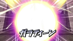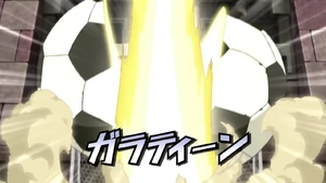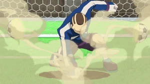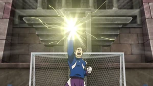 The user gets into position, extending their left arm upwards and winding back their right arm, gathering bright yellow energy in their right hand. They then extend their right arm upwards, summoning a huge, swordlike beam of light, piercing through the clouds. As the ball heads towards the goal, they quickly hop off of the field and slash it down with the swordlike beam, cutting it in half and opening a tear on the ground in front of them if successful.