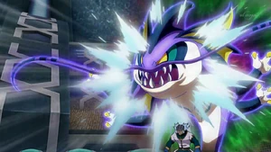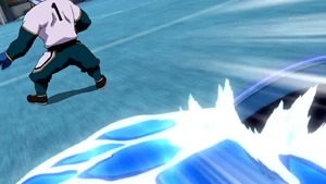 As a pool of water swims towards the user with a protruding dorsal fin, they quickly get into position and reel their body back, bending both of their arms backwards as a vicious water geyser spouts behind them, turning the surrounding area dim. Their Keshin then emerges from the geyser, flailing its arms around haphazardly as the user leans their upper body forward, with their Keshin following suit and opening its huge mouth, revealing a growing whirlpool. Once their Keshin reels its body back, it abruptly leans itself forward and spouts out the whirlpool from its mouth at the incoming ball, drawing its power as it swiftly rotates into its maw, akin to a screw, coming back into reality and biting it down if successful.