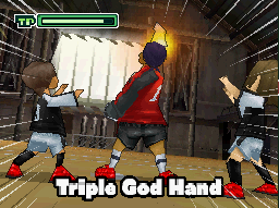 God Hand Triple (ゴッドハンドトリプル, Goddo Hando Toripuru) is a game exclusive combination catch hissatsu technique introduced in Inazuma Eleven 2: Kyoui no Shinryakusha.
