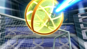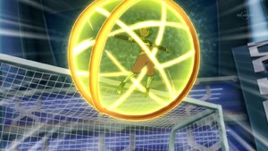 The user quickly gets into position, twisting their body slightly to the side with both of their arms extended outward, rapidly rotating around as a golden ring orbits around them. As they keep on spinning, the outer ring gathers swirls of wind, lifting themselves into the air and making various rings appear around them, encasing them in a sphere of golden energy. Once they reach their desired altitude, they come to a sudden halt and reel their body back, withstanding the incoming shot as it viciously traverses haphazardly through the ringed sphere, landing on the field and catching the ball in both of their hands if successful.