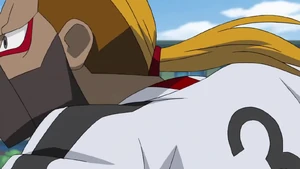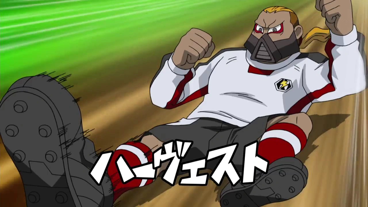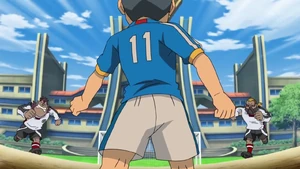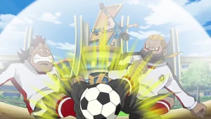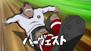As their opponent dribbles with the ball, plant shoots begin to emerge in the field and entangle them. The two users then run side by side and jump in the air, spinning their bodies as their right feet get covered with bright blue energy. Once the users volley, the bright blue energy turns into a crescent-shaped slash onto the field, harvesting the plants and blowing them away.