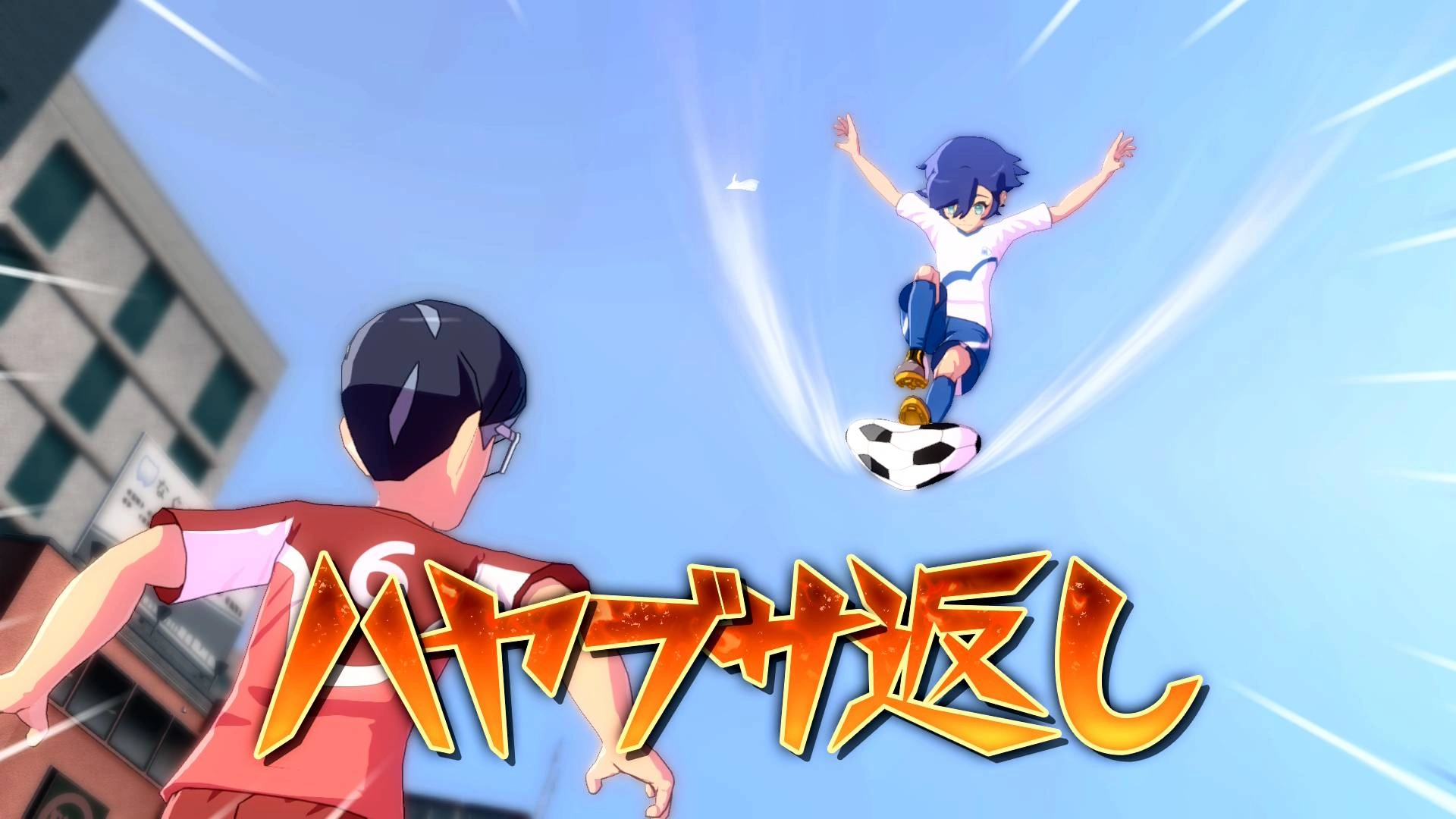 As their opponent tries to find the user's whereabouts, they rapidly descend with their left foot on top of the ball, with their arms raised into the air and surrounded by a V-shaped veil of wind. Once they're face-to-face with their opponent, they viciously perform a front flip and kick the ball at their opponent, leaving a burst of feathers and a fleeting bright blue oval cut as they're blown away, landing back on the field with the ball by their feet.