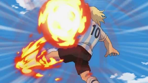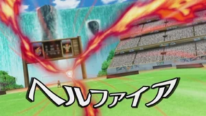 In the match between The Empire and Inazuma Japan[3], Leone used Hellfire 改, breaking through Tachimukai's defense and successfully scoring The Empire's first goal. Diego used it to try to score, but it was stopped by Tachimukai's Maou The Hand.