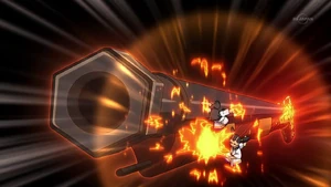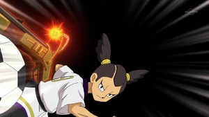 Two users stand next to each other as the one with the ball positions themselves ahead of the other, with both quickly getting into position and simultaneously crouching. The one ahead then springs into the air alongside the ball, with the other setting their right foot on fire and following suit. As the surrounding area turns dark, the one with the ball spins around and extends their right leg forward, placing the ball atop of their right foot with an ignited matchlock appearing behind them. Once the rope on the matchlock is nearly burnt, the other user slowly completes their frontflip and abruptly dives onto the ball with their ignited right foot, coming back into reality and setting it ablaze, rapidly firing it akin to a bullet.