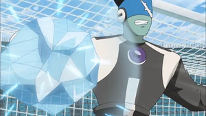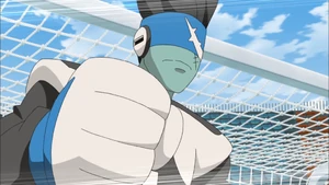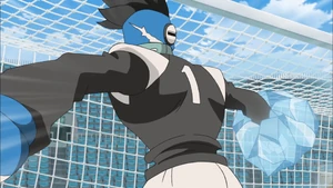 The user twists their body and raises their right arm in the air, gathering icelike energy in their right hand and reeling their arm to their back. As the ball heads towards the goal, the icelike energy in their hands grows, looking like a snowflake, quickly punching the ball and freezing it if successful.