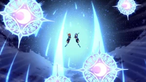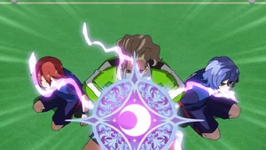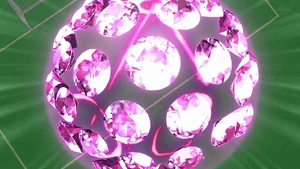 First, the goalkeeper smashes their fists together, forming a moon-shaped symbol aura with purple electricity around it. Two other defenders next to the goalkeeper leap upwards and together form an expanding ball of blue energy. The moon-shaped symbols start to rain downwards from the sky as the goalkeeper waves his arms to generate many shiny crystal diamonds like a dome shield around him. If the save is successful, the shoot will hit one crystal and reflect and reverberate inside the crystal dome, eventually slowing down and halting in the goalkeeper's hands.