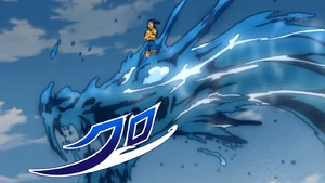 The user comes to a sudden halt and closes both of their eyes, quickly getting into position and crossing their arms, making a vicious deep blue whirlpool swirl below their feet. As the surrounding area turns hazy, a water butte abruptly arises underneath them, making the ball follow suit and spring itself into the air. Once they reach their desired altitude, the water butte turns into a white-eyed water dragon, gripping the ball with its fangs and covering it in a veil of turquoise energy. The dragon then dives onto the field below, briskly hitting their opponent and blowing them away as it undulates ahead, with the user unwaveringly standing atop its head, successfully getting past them.