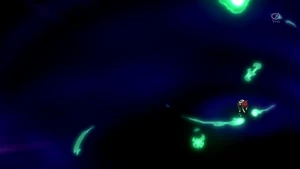 The user comes to a sudden halt and gets into position, quickly crouching and leaning their upper body down, turning the surrounding area dark. As small, green onibi appear around them, they quickly scatter themselves and spiral downwards onto the ball, covering it with ghostly green energy and slowly lifting it in the air while rapildy spinning. The user then reels back their right leg, shooting the ball with their right foot, fading in and out of reality as it heads towards the goal.