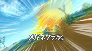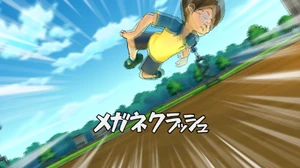 In the match between Raimon and Shuuyou Meito Gakuen[1], Megane ordered Someoka to use Dragon Crash, heading it towards the goal, breaking through Idol's Goal Zurashi and successfully scoring Raimon's first goal, cracking his glasses in the process. While trying to get up from the sudden impact, Megane gave the technique its name before collapsing on the field.