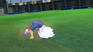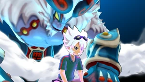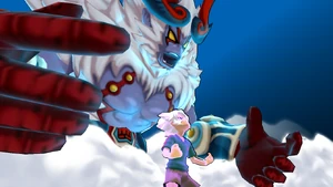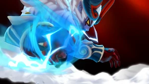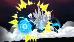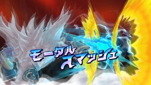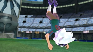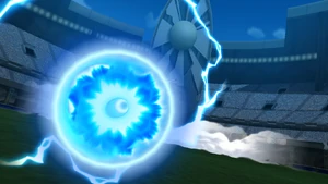 The user performs a backflip, landing on the field and placing both of their hands on the ground, raising a small cloud of dust as the surrounding area turns dark. They then reel their body back, standing upright as their Keshin appears behind them, with both of them roaring at the same time as a white mist covers the vicinity. As the Keshin clenches its right hand, it gathers swirls of bright blue lightninglike energy in its fist, tinging the background crimson as it gets into position, reeling its right arm back with the user following suit and springing towards the airborne ball, covered in a veil of bright blue energy. Once they close in on the ball, they abruptly dive with both of their feet as their Keshin simultaneously punches it with its right fist, coming back into reality as it curves towards the goal, with swirls of lightning cracking through the bright blue orb of energy.