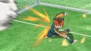 In the match between Raimon and Teikoku Gakuen[6], Endou used it, barely deflecting Jimon's Hyakuretsu Shot, rebounding off of the crossbar.