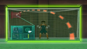 The user comes to a sudden halt and raises both of their arms in front of their eyes, extending both of their index fingers and thumbs, forming a square. They then move both of their arms to the side, making a rectangular digital screen appear, scanning the best course of action to take. Once the user 99.999% probability of scoring, they shoot it with their right foot, covering it with yellow energy as it lobs towards the goal.