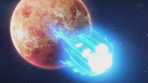 After leaping high into the air with a burst of blue energy, the user emerges from a planet with the ball by their side. The user then quickly shoots the ball into the planet, which shatters and erupts into flames as the ball shoots toward the goal.