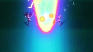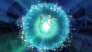 JP:Gather everyone's power into the ball! A glittering twin shoot. (T.B.A. ) EN:Concentrate everyone's power on the ball in this glittering shot!