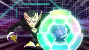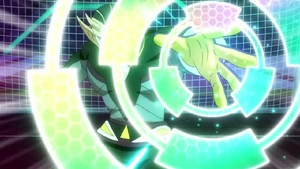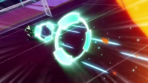 The user quickly gets into position, slightly twisting their body to the side and stretching their arms around, rapidly thrusting their left bent arm downwards and clenching their left hand into a fist. They then violently shake their whole body, making a holographic, bright green disk form around their left fist, slowly winding back their left arm. As the ball heads towards the goal, they briskly thrust their left arm forward, splitting the holographic disk into three layers of rings, each bigger than the other, shielding themselves from the incoming shot before being swiftly deflected ahead if successful.