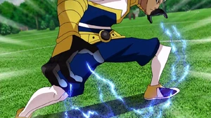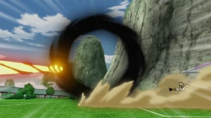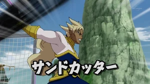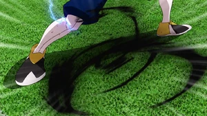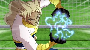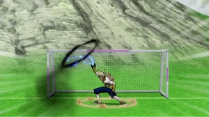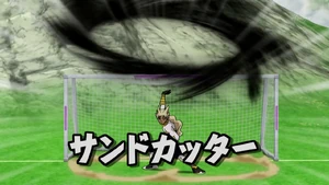 The user clamps both of their hands together, quickly opening them again parallel to each other as swirls of bright blue lightninglike energy crack in between them. They then get into position and reel both of their arms to their back, gathering a vicious veil of ironsand from the field below them onto the lightninglike energy, making it rapidly whirl around in the air akin to a circular saw. As the ball heads towards the goal, they abruptly thrust the ironsand veil onto it, rapidly dispersing the lightninglike energy around it and tearing through the field as it drains the incoming shot of its power, cutting the ball in half if successful.