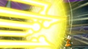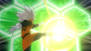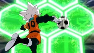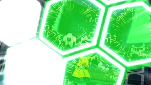 As the ball rapidly drops onto the field, the user quickly gets into position and turns themselves to the side, stomping on the ball with their left foot and making it rise into the air. They then swing their right arm to the side, creating a shelllike shield with seven green hexagonal panels in front of them. Once they reel back their right leg to the side, they abruptly volley the airborne ball with their right foot, covering it in yellow energy as it's detained by the green shell. As each panel is lit up, seven small orbs of yellow energy individually appear in front of the panels, with the user turning around and thrusting their right arm forward, briskly firing seven yellow beams towards the goal.