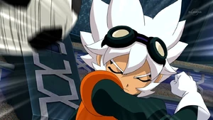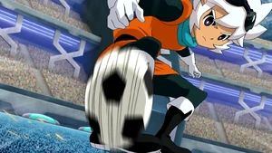 In the match between The Lagoon and Chrono Storm[1], SARU used it, quickly breaking through Shinsuke's defense while Mixi Maxed with Liubei, successfully scoring The Lagoon's first goal. SARU used it again while both Mixi Maxed with S Idenshi and Keshin Armed with his Keshin, Evarth[2], quickly breaking through Shinsuke's Taikoku Ouka 改 while Mixi Maxed, successfully scoring The Lagoon's fourth goal. SARU used it once more while both Mixi Maxed and Keshin Armed to try to score, quickly breaking through both the combined volley of Tenma, Shindou, and Tsurugi while Mixi Maxed and Shinsuke's 真 Taikoku Ouka while Mixi Maxed, but it was rebound off of the crossbar.