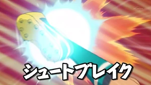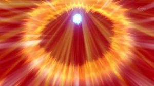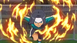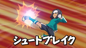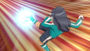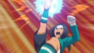 The user closes their eyes and crosses both of their arms in an X-shape, covering themselves in a veil of bright yellow flamelike energy. As the ball heads towards the goal, they open their eyes again and reel back both of their arms, abruptly lunging themselves towards the incoming shot. Once they close in on the ball, they get into position and dive onto it with their right foot, rapidly performing a series of nonstop kicks with both of their feet and sending it high into the air, making it quickly burst as they land back on the field if successful.