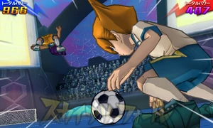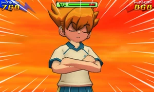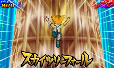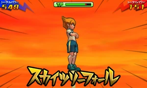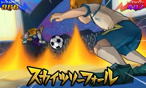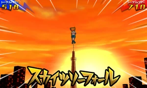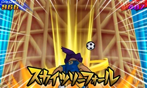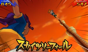 As the surrounding area turns to dusk, the user stands atop of the Toukyou Skytree with both of their arms crossed, gazing at the sunset. They then get into position and hop off of the Toukyou Skytree, performing an aerial backflip and rapidly turning themselves around, facing their opponent and covering themselves in a yellow veil of energy while extending their right leg downwards. Once they close in on their opponent, they quickly hit the field below them and make it briskly shake, blowing them away into the air and coming back into reality as the ball bounces back towards them, successfully stealing it from them.