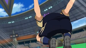 The user kicks the ball up and runs forward. The user then jumps and grabs the ball between their knees and spins forward. When coming in a 180 degree angle, the user slightly twists their feet and an energy gets sucked in the ball. The user lands on one knee and the shot gets fired towards the goal in a yellow-blue aura.