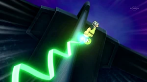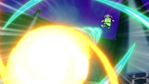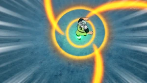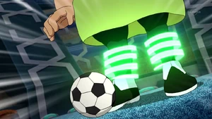 The user comes to a sudden halt with the ball by their feet, closing their eyes and bending both of their arms upwards. They then open their eyes again, thrusting both of their arms downwards and turning the surrounding area dim, gathering swirls of yellow energy into the ball and covering their legs with spiraling bright green energy, akin to a spring. As they draw the ball to them, they trap it between both of their feet and abruptly spring into the air, stiffly spinning themselves around and leaving a trail of coiling bright green energy. Once they reach their desired altitude, they release the ball between their feet, coming back into reality as it rapidly heads towards the goal, akin to an arrow, leaving a trail of bright green energy rings behind it.