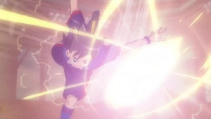 The user kicks the ball into the air with their heel. Pulling back their right arm, with electricity coming off of it, they then cross their arms before reeling backwards, releasing an electrifying sun-like energy that covers the ball. The user gets on all fours before they jump into the air. They do a front-flip, kicking the ball downwards with their heel, sideways, and downwards again, making the ball shine and descend towards the goal in a blitz of sunlight.