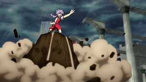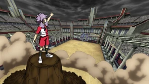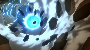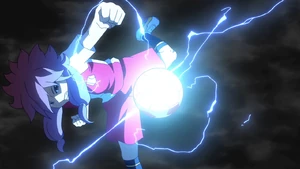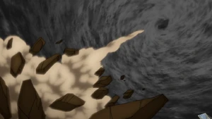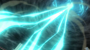 The user comes to a sudden halt, closing their eyes and quickly winding their right arm diagonally. They then open their eyes again and swipe their right arm to the side, opening their right palm as a butte arises from the field below them, turning the surrounding area into a stormy sky as lightning begins to crack. Once the butte reaches its desired altitude, the user abruptly springs into the air, rapidly diving and spinning their whole body around, forming a dark tornado with fleeting swirls of lightning. As they keep on spinning, they get into position and volley the ball down with their right foot, covering it in lightning as it briskly dives onto the field, with the dark tornado surrounded by swirls of lightning following it behind as it tears through the ground.