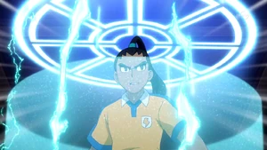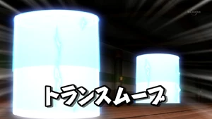 The user comes to a sudden halt before their opponent, quickly getting into position and reeling their body back, closing both of their eyes while bending their arms frontward. They then clench both of their hands into fists and punch them together, opening their eyes again as a bright blue circular panel appears above them, encasing them in an electric cylinder. As their confused opponent looks around at their surroundings, another circular panel appears above them, rapidly encasing them in a cylinder and swapping positions with the user, successfully getting past them.