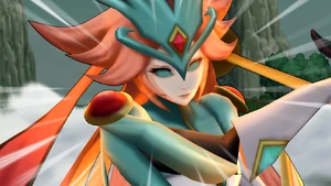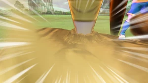 The user's Keshin leans its upper body forward as a white mist covers the field, abruptly reeling its body back and making both of its eyes glow brightly, quickly dispersing a veil of bright yellow swirls whirling around it. The user then gets into position, bending their right arm upwards to their left side, with their Keshin following suit and raising its double-sided flagged spear into the air with its right hand. Once they swing their right arm to the right, their Keshin simultaneously swings its spear and raises a vicious air current onto their withstanding opponent, rapidly piercing its spear onto the field below and making a butte arise underneath both it and the user, turning the sky pink as their opponent is blown away, making the ball bounce towards them as the sun shines them down.