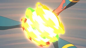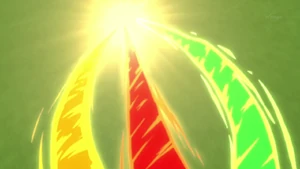 The three users kick the ball to each other while standing in a triangle. This creates a whirlwind, which takes the users and the ball up. Inside the whirlwind, the users kick the ball. When the energy of the kick has gone around the ball, they kick the ball out of the whirlwind with triple color rays. The three rays collide and then go right, left and center of the goal.